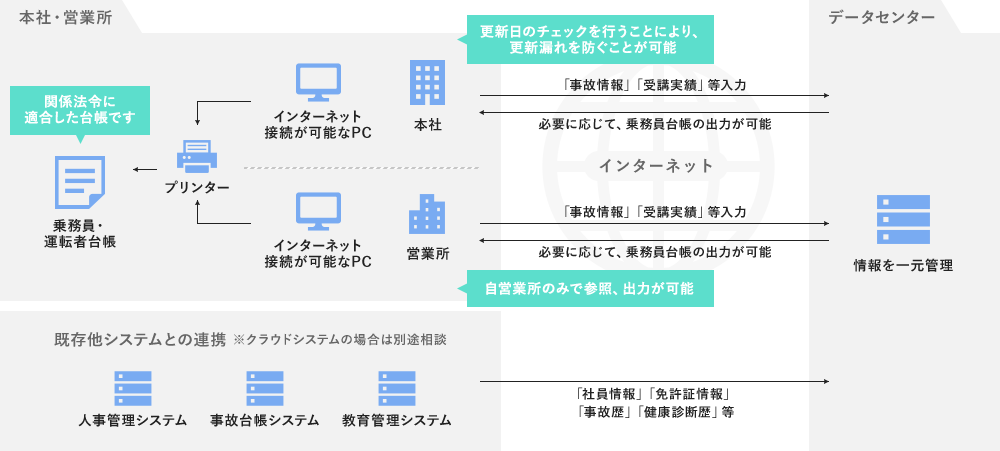 乗務員・運転者台帳システムと人事管理システムなどの他のシステムとの連携で、権限のある方であれば、人事基本情報、運転免許証情報、事故歴、健康診断受診履歴、教育受講履歴などの最新情報を閲覧できます。