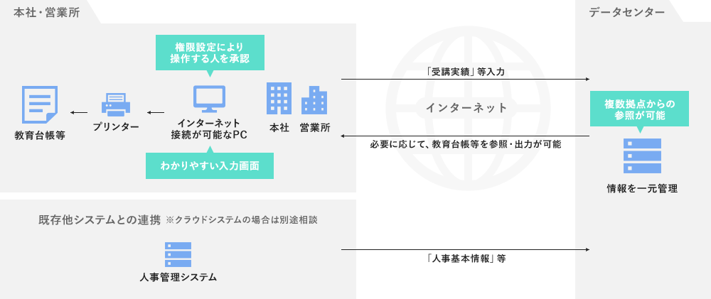 人事管理システムなどの他のシステムとの連携で、権限のある方であれば、人事基本情報や教育履歴などの最新情報を閲覧できます。また、教育項目をマスター化し、教育受講実績の入力や未受講者検索などが行えます。