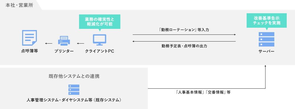 勤務割の作成、乗務員割当計画、点呼簿作成、実績勤怠入力、給与系システムへのデータ連携などが総合的に行えます。また計画段階から改善基準告示項目のチェックが可能となり、人為的ミスを事前に防止できます。